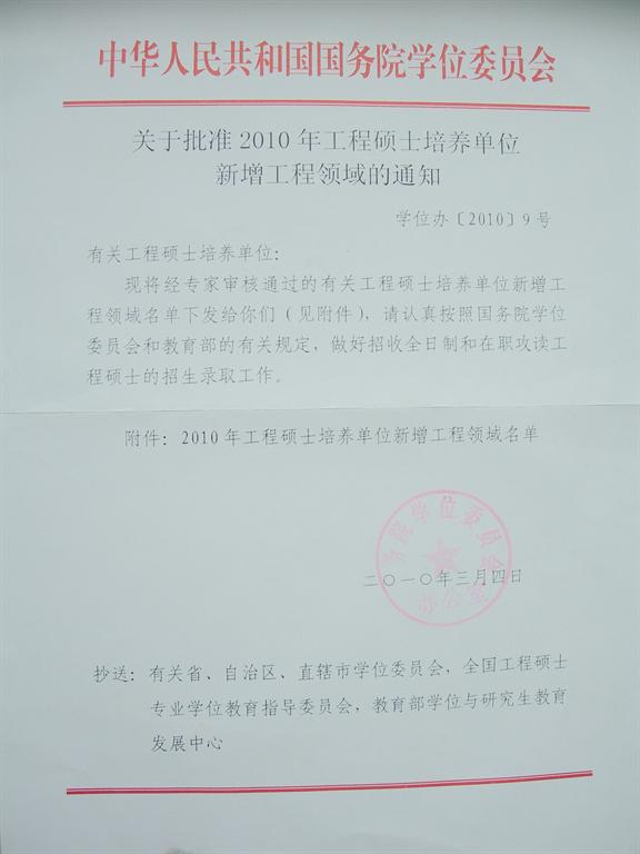 附件:《关于批准2010年工程硕士培养单位新增工程领域的通知》(学位办【2010】9号)