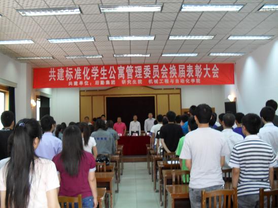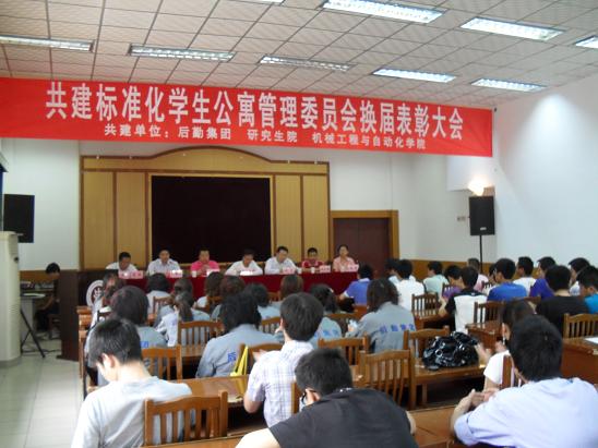 和机械工程与自动化学院共同举办的共建标准化学生公寓管理委员会换届选举表彰大会在科艺苑隆重召开。与会老师为上一任的优秀学生干部颁奖,为新一任的学生干部颁发聘书,并作了简明、精炼的讲话。肯定了上一任楼管会干部认真负责的工作,同时也给新一任的楼管会干部提出了殷切的希望,希望在前一任干部工作的基础上,更加认真的工作,并把工作做到更好。